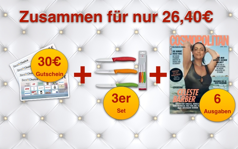 Nur für kurze Zeit könnt Ihr Euch einen 30€ Best-Choise-Gutschein + ein 3-tlg. Messerset von Victorinox + 6 Ausgaben der Zeitschrift COSMOPOLITAN (Printausgabe) für nur 26€ bestellen.