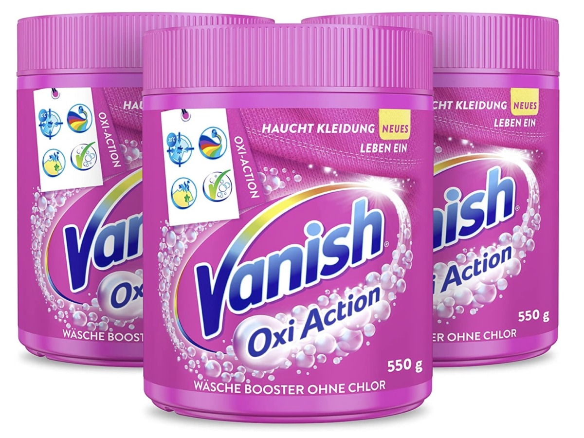 - Lieferumfang: 3 x 550 g Vanish Oxi Action Pulver Pink / Ohne Chlor / Entfernt Flecken schon ab 30°C, pflegt die Farben & entfernt Gerüche / Bitte Pflegehinweise des Herstellers beachten