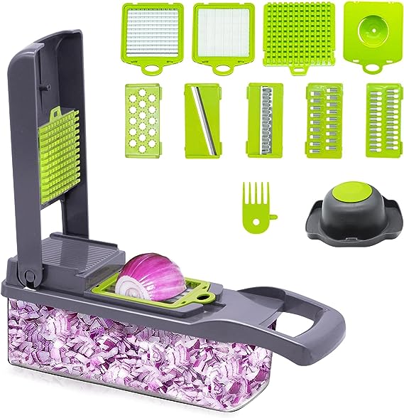 - 9-in-1-Gemüseschneider: 9 Messer zum Würfeln, Hacken, Reiben, Hacken und Schneiden von Eiern. Spiral-Gemüseschneider mit hervorragender Schneidfunktion zum einfachen und perfekten Schneiden von Tomaten, Zwiebeln, Karotten, Gurken, Kürbissen, Zucchini und mehr
