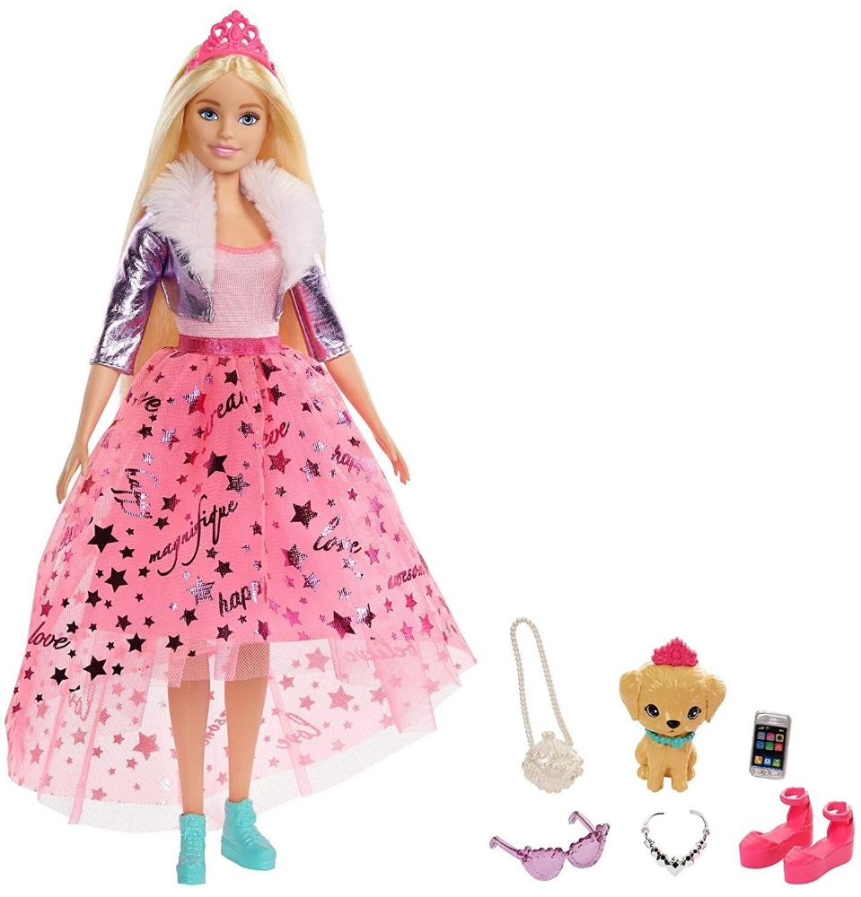 Die Barbie-Puppen sind von den Barbie Prinzessinnen-Abenteuern inspiriert und schicken junge Träumer in ein weit entferntes Land, in dem die Fantasie herrscht. Diese Barbie-Puppe liegt voll im Trend mit ihrem pinken Oberteil und ihrem Rock, der vorne kurz und hinten lang ist und über süße, glitzernde „believe“-, „happy“-, „dream“-Schriftzüge und mehr verfügt. Die mit Fell ausgekleidete Metallic-Jacke und ihre blauen hohen Schuhe bringen Farbe in ihr Outfit. Die Barbie-Puppe wird erst mit ihren stylischen Accessoires zu einer Modeikone und auch ihr tierischer Begleiter darf bei diesem tollen Abenteuer nicht fehlen: Ihr Hündchen sieht mit seinem Diadem und Halsband super süß aus.