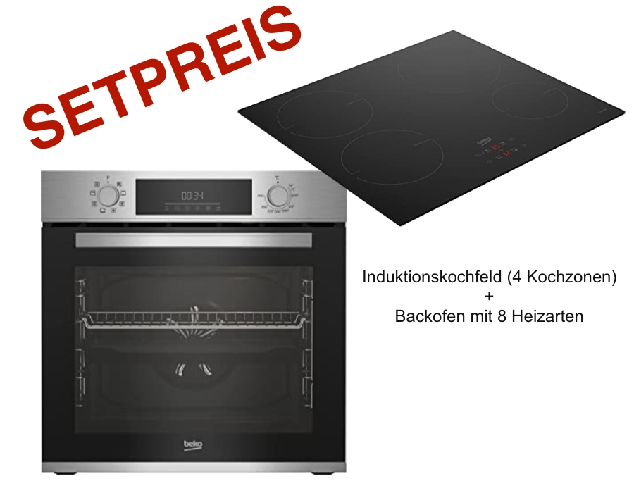Beko BBSM12340X Einbau-Backofen-Set Gerätemaße H x B x T (cm): 59,5 x 58 x 56,7 Das Backofenset BBSM12340X ist ein Set bestehend aus zwei autarken Geräten, einem Multifunktionsbackofen (BBIM12300X) und einem Induktionskochfeld (HII64400MT).