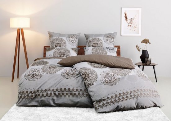 Geschmackvolles Design kehrt mit der dekorativen Bettwäsche „Tesso“ aus dem Sortiment von my home im Schlafzimmer ein. Kissen- und Bettbezug sind mit ansprechenden Ornamenten in harmonisch aufeinander abgestimmten Farbtönen bedruckt. Sie haben ein angenehmes Material, das zum Anschmiegen und Einkuscheln einlädt. Zudem zeichnen sich die Bezüge durch praktische Eigenschaften aus. Ausgestattet sind sie mit einer verdeckten Knopfleiste. Zudem sind sie bei bis zu 60 °C hygienisch in der Maschine waschbar. Die dekorative Bettwäsche „Tesso“ der Marke my home kombiniert eine schicke Optik mit nützlichen Details.