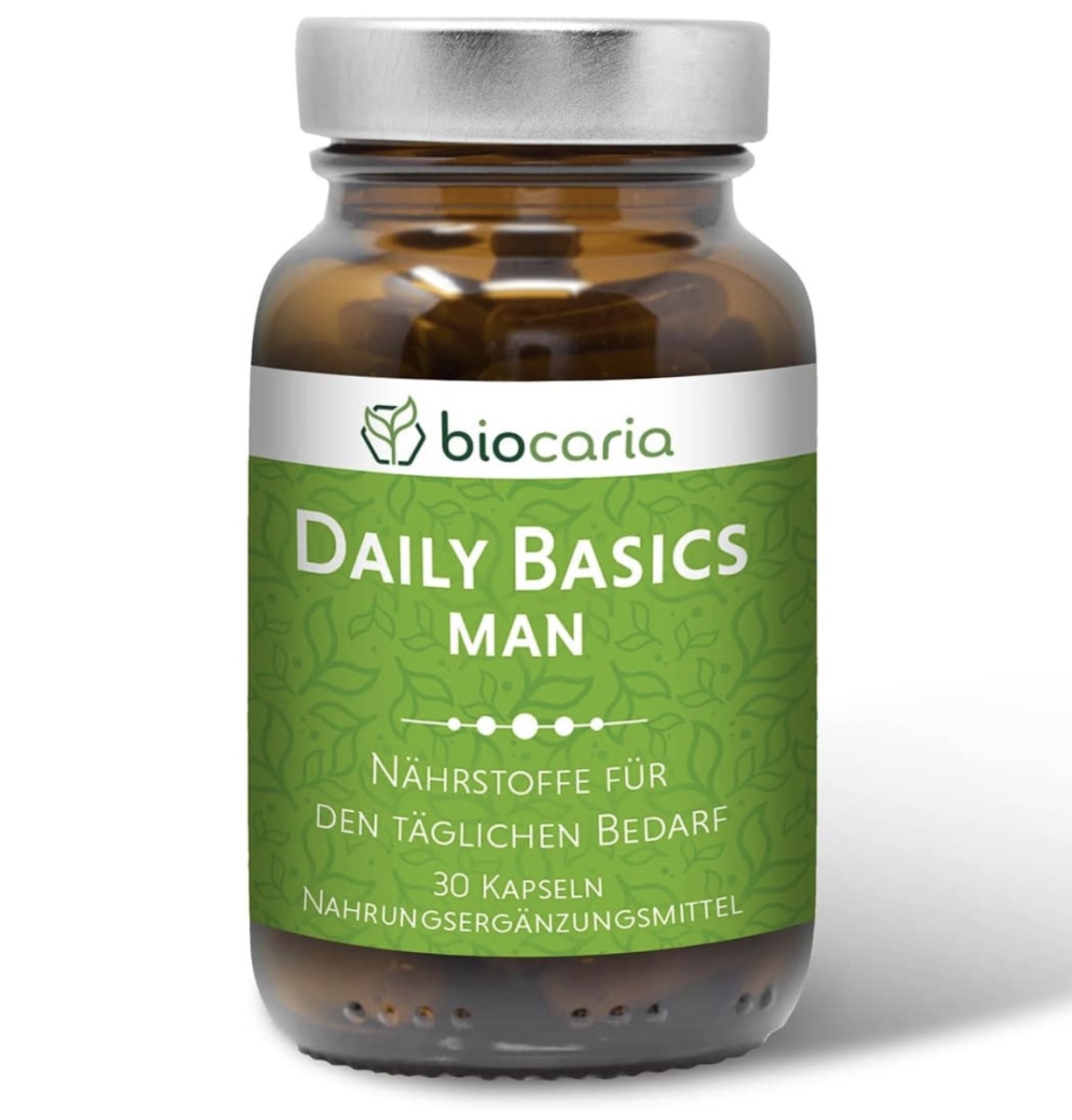 Biocaria DAILY BASICS MAN ist eine Nahrungsergänzung speziell für die Bedürfnisse des Mannes: Die Kapseln enthalten 200 mg natürliches Kürbiskernextrakt, mit 100 mg Vitamin C, 7,8 mg Zink und 2,9 mg Eisen. Darüber hinaus verfügen die Kapseln über ein Plus an Vitamin B1, B6, K1 und D3 kombiniert mit Pantothensäure und Folsäure sowie den Spurenelementen und Mineralien Mangan, Kupfer und Molybdän. Das Kürbiskernextrakt ist reich an natürlichen sekundären Pflanzenstoffen. Damit ist die Kapsel perfekt für die tägliche Nährstoffzufuhr des männlichen Körpers und die Stärkung des Immunsystems geeignet. Das Kürbiskernextrakt kann entzündungshemmend sein und sich positiv auf den ganzen Körper auswirken. Die Kapseln sind eine sinnvolle Ergänzung für jede ausgewogene Ernährung des Mannes.