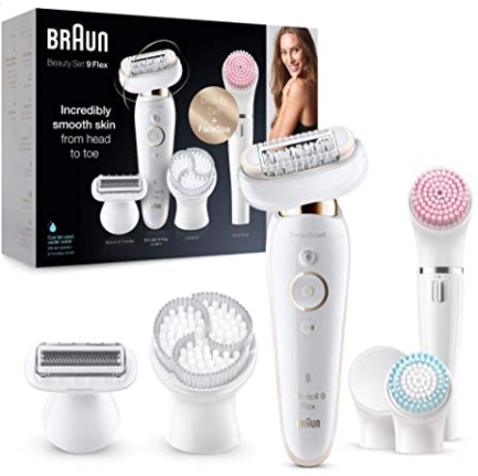 Braun Silk-épil 9 Flex Beauty-Set, Epilierer Damen, FaceSpa Gesichtsepilierer, 9 Aufsätze, Tasche, mit flexiblem Kopf für einfachere Haarentfernung, Geschenk für Frauen, 9100, weiß/gold. Bei Amazon jetzt im Angebot für 129,99€.