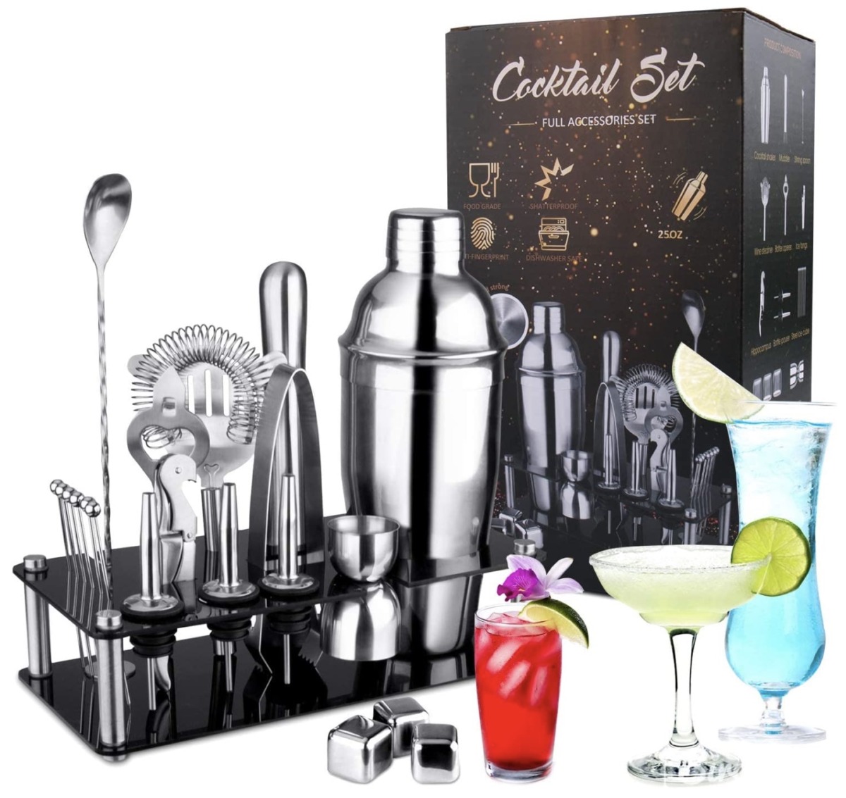 • PROFESSIONAL COCKTAIL SET – 750ml Shaker, Eiszange, Stößel, Rührlöffel, Korkenzieher, Ausgießer, Messbecher, Fruchtgabel, Barsieb, 3 Whisky Steine und ein Acrylständer.