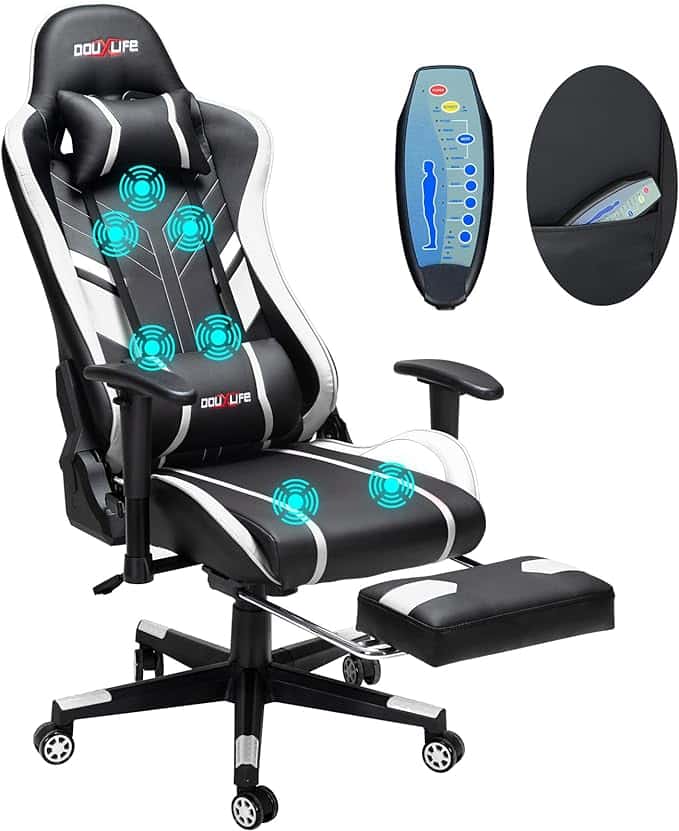 - 【Mehrere Konfigurationen】Der Douxlife Gaming Stuhl mit Massagefunktion kann die Höhe der Armlehnen an verschiedene Spieler und Bürosituationen anpassen und passt sich perfekt Ihren Händen an. Ausgestattet mit abnehmbarer Kopfstütze und Lendenpolster zur optimalen Anpassung an die Rundung Ihres Rückens. Unsere Gaming-Stühle sind außerdem mit Fußstützen ausgestattet, sodass Ihr Körper sich vollständig ausruhen und rundum Komfort genießen kann, egal ob Sie arbeiten oder spielen.