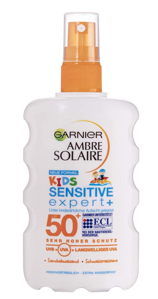 Garnier Ambre Solaire Sonnenschutz-Spray für Kinder mit LSF 50+. Zieht schnell ein und ist wasserfest und enthält keine Parfüm- oder Farbstoffe und ist in der 200 ml Sprühflasche im Sparabo für 7,95€ bei Amazon bestellbar (1 Ltr. = 39,75€).