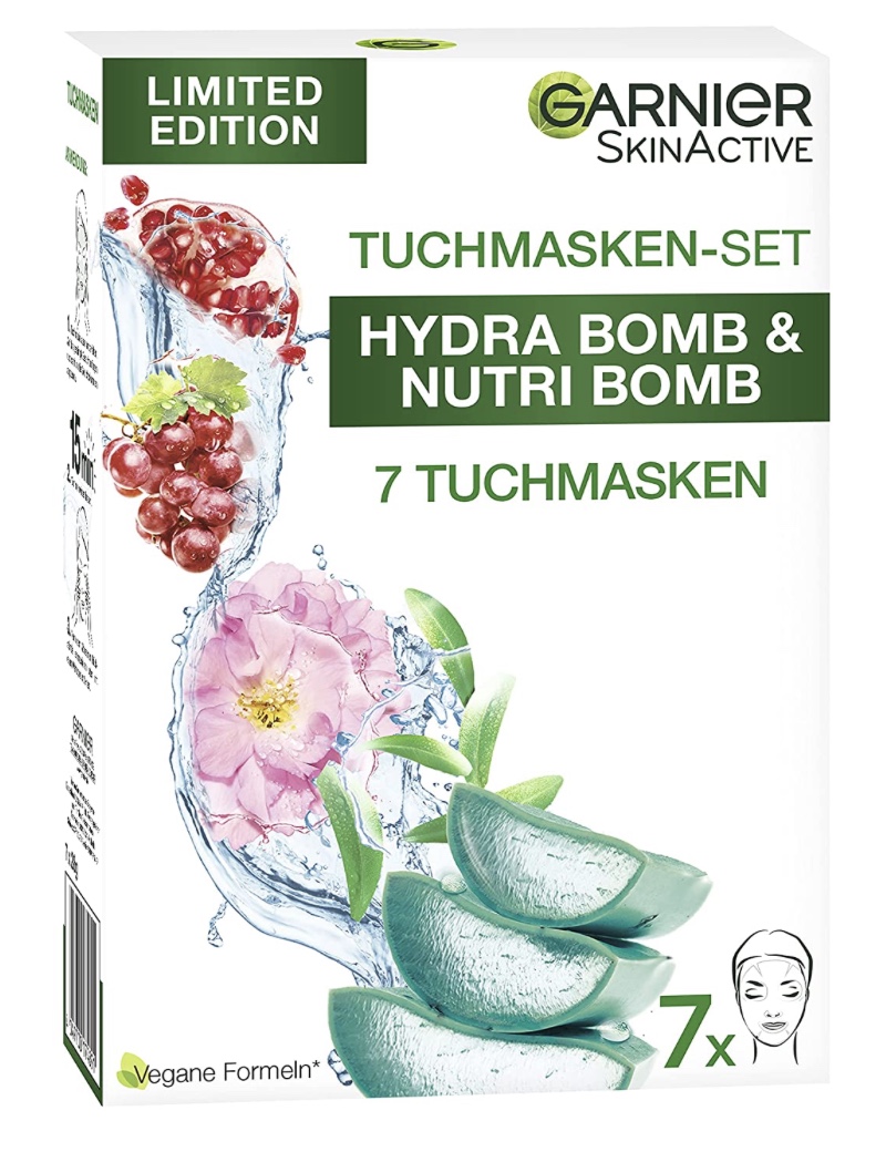- Lieferumfang: 7x Garnier Gesichtsmasken im Beauty Set (5x Hydra Bomb Tuchmaske, 1x Schwarze Tuchmaske, 1x Nutri Bomb Tuchmaske), Inhalt: 7 x 28g