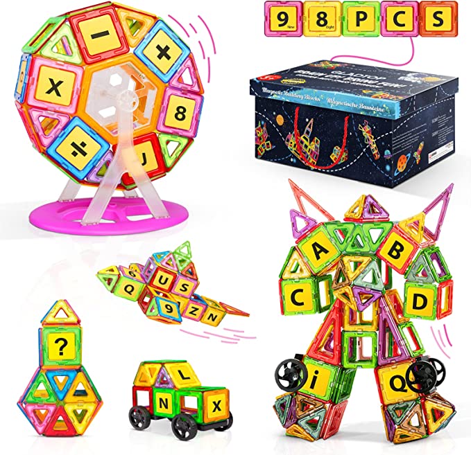 - 【Starke Magnetische Bausteine 98 Teile】Unsere Magnetische Bausteine bieten das beste Preis-/Leistungsverhältnis. 20 Dreiecke, 24 Quadrate, 2 Sechsecke, 2 Halbkreise, 4 gleichschenklige Dreiecke, 42 nichtmagnetische Karten (26 Buchstaben und 16 Mathematik), 1 Riesenrad, 2 Autoradsätze, 1 kreative Anleitung und 1 Geschenkbox. Du kannst Riesenräder, Bulldozer, Flugzeuge, Tiere und vieles mehr bauen.