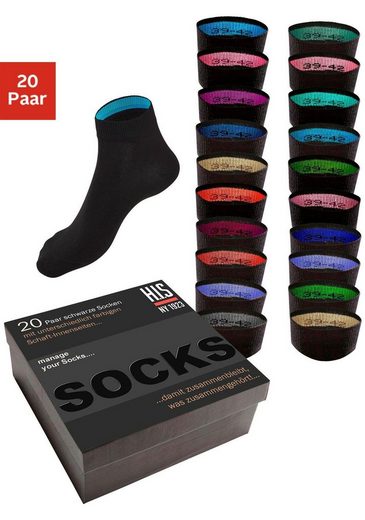 H.I.S präsentiert seine klassischen Kurzsocken für den täglichen Gebrauch in der superpraktischen 20er-Geschenkbox. Die hochwertigen, pflegeleichten Socken sind ideal für Freizeit und Business und behalten durch das leicht elastische Material immer ihre optimale Passform. Für den richtigen Sitz sorgt ein bequemes Komfortbündchen in Rippoptik. Die Sortierung in Sockenpaare wird durch farbige Innenbündchen zum Kinderspiel. Der passende Begleiter für jeden Anlass – die Kurzsocken von H.I.S in der 20er-Geschenkbox!