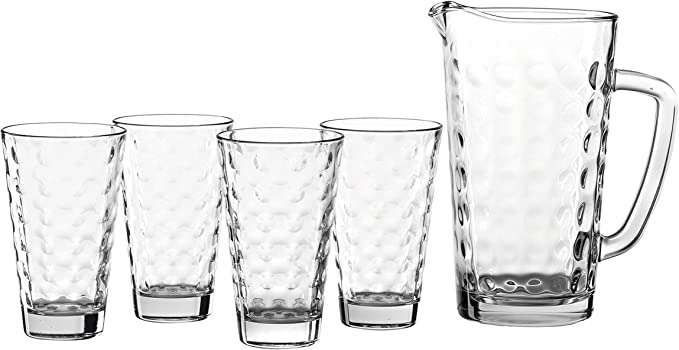 - Praktischer Alltagsbegleiter – Schorlen, Wasser, Säfte, Limonaden und auch Cocktails lassen sich mit dem Set, bestehend aus einer Glas-Karaffe mit Henkel und vier Longdrink-Gläsern, stilvoll servieren.