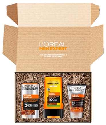 - Lieferumfang: 1x L’Oréal Paris Men Expert Energy Box Hautpflege-Set für Männer, inkl. 1x Hydra Energy Waschgel für Männer (100 ml), 1x Hydra Energy Feuchtigkeitspflege 24h Anti-Müdigkeit (50 ml), 1x Hydra Energy Duschgel für Männer (300 ml)