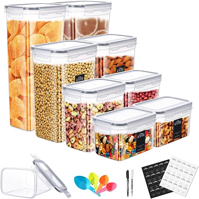 • 【8PCS VORRATSDOSEN MIT DECKEL LUFTDICHT】: Vorratsbehälter mit 2,8 Litern (2 PCS), 2 Litern (2 PCS), 1,6 Litern (2 PCS), 0,8 Litern (2 PCS), mit 40 nutzbaren Etiketten zur Kennzeichnung der gelagerten Lebensmittel, 2 Stiften und 4 großen Löffeln.