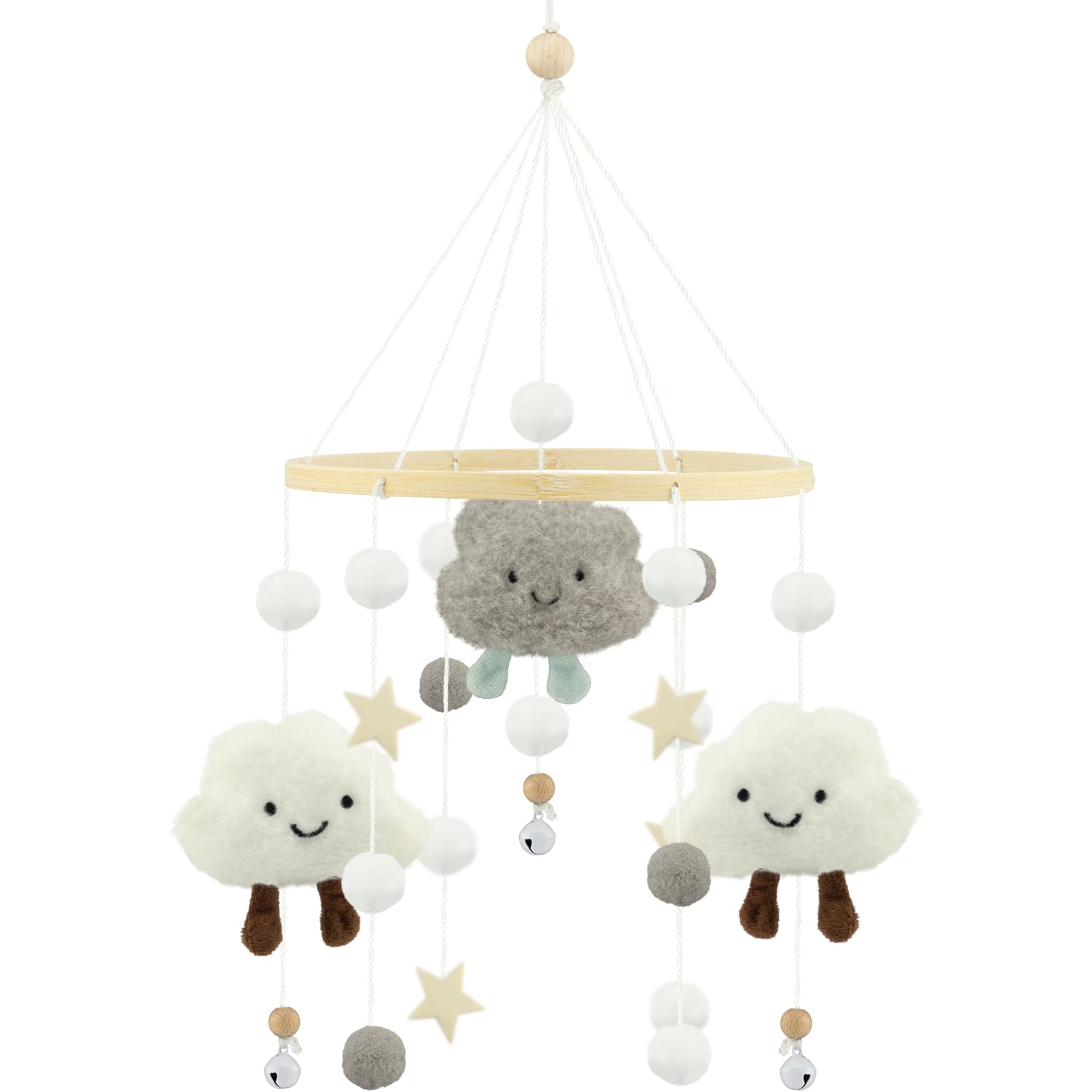 Die einzelnen Elemente werden am Holzbügel aufgehängt. Dieses Mobile verfügt über 19 Filzelemente (3 Wolken und 16 Kugeln), 3 Sterne und 3 Holzkugeln und schließlich 3 Metallglocken.