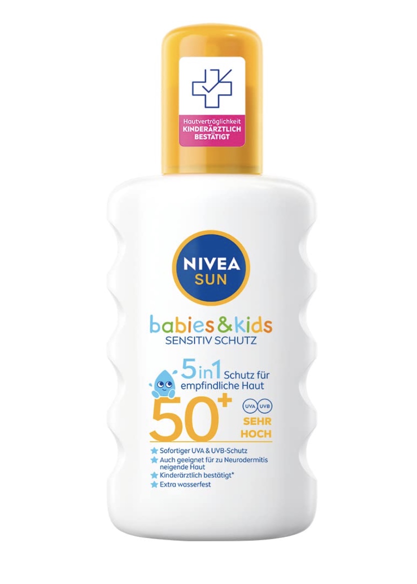 - Lieferumfang & Details – NIVEA SUN Babies & Kids Sensitiv Schutz Sonnenspray LSF 50+ (200 ml), Sonnenschutzspray für empfindliche Baby- & Kinderhaut, ab dem Alter von 6 Monaten, Artikelnummer 85847