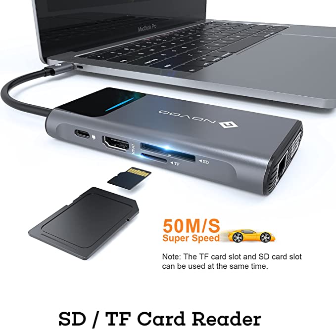 - NOVOO USB C HUB erfüllt Ihre täglichen Anforderungen: Dieses USB C Docking Station verwandelt einen einzelnen Typ C in 9 Anschlüsse: USB-C zu HDMI 4K & VGA 1080P, USB3.0 *3, Typ C Power Delivery 100W-Ladeanschluss, SD- und Micro-SD-Karte Lesersteckplatz, 1000 Mbit/s RJ45-Ethernet. NOVOO USB C HUB Erweitern Sie Ihre Arbeitsmöglichkeiten und sorgen Sie für eine stabilere Leistung.