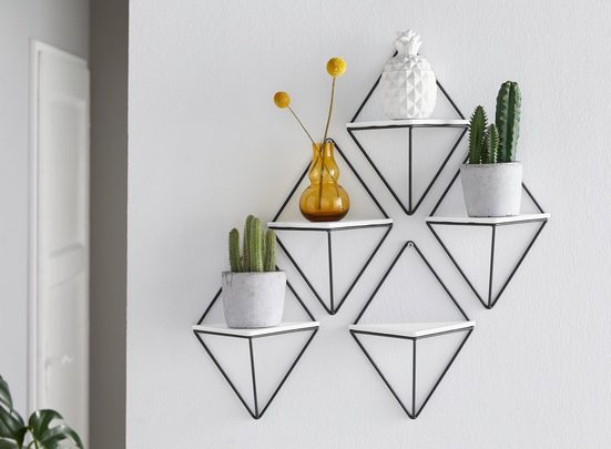 Regale kommen im Rudel! Das ist zumindest bei den modernen Wandregalen »Rauten Rudel« von COUCH der Fall. Du erhältst ein 5-teiliges Set von formschönen Wandaccessoires in gleicher Form und Größe, die sich mit ihrer kleinen Ablagefläche als nützliche Dekorationshilfen erweisen. Ihre geometrischen Metallstreben sind ein toller Blickfang, doch zusammen mit kleinen Kunstpflanzen oder Kerzen auf den dreieckigen Regalbrettern verschönerst du deine Wände auf charmante Weise. Wie kleine Pyramiden stehen die COUCH Wandregale »Rauten Rudel« ab und können nach deinen individuellen Vorstellungen platziert werden.