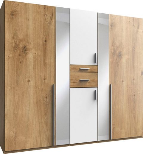 Zeitlos und funktional präsentiert sich Drehtürenschrank »Odessa« aus dem Hause Wimex mit Schubkästen auf Metallschienen. Das moderne Design in Holzoptik besticht durch schmale Spiegeltüren und zwei Schubkästen auf mittlerer Höhe. Darin lassen sich Socken, Krawatten, Wäsche oder Accessoires platzsparend unterbringen. Hinter den Türen des Kleiderschranks steht dir genügend Platz für deine Garderobe zur Verfügung. Hemden, Blusen und Kleider kannst du an der Kleiderstange unterbringen. Ober- und Unterbekleidung finden einen Platz in den offenen Fächern. Qualitativ überzeugt der Schrank durch eine Fertigung aus stabilem Holzwerkstoff. In mehreren attraktiven Farbstellungen erhältlich: der stilvolle Drehtürenschrank »Odessa« aus dem Hause Wimex mit Schubkästen auf Metallschienen.