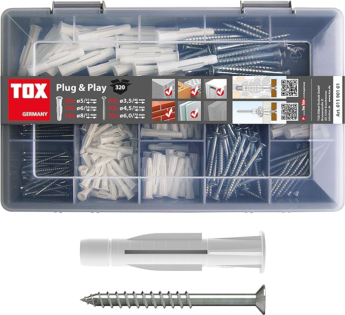 Der TOX Sortimentskoffer Plug & Play Dübel ist ein 320-tlg. Set mit Allzweckdübel TRIKA 5×31 mm (60, 6×36 mm (70, 8×51 mm (30 St.) + passende Schrauben, für nahezu alle Baustoffe.