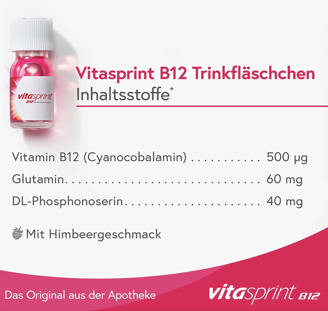 Vitasprint B12 Trinkfläschchen Wirkstoff: Cyanocobalamin (Vitamin B12), (RS)-2-Amino-3 (phosphonooxy) propansäure (DL-Phosphonoserin), Glutamin. Anwendungsgebiete: Traditionell angewendet zur Besserung des Allgemeinbefindens. Warnhinweis: Enthält Sorbitol. Freiverkäuflich. Stand: 12/2020. Zu Risiken und Nebenwirkungen lesen Sie die Packungsbeilage und fragen Sie Ihren Arzt oder Apotheker.